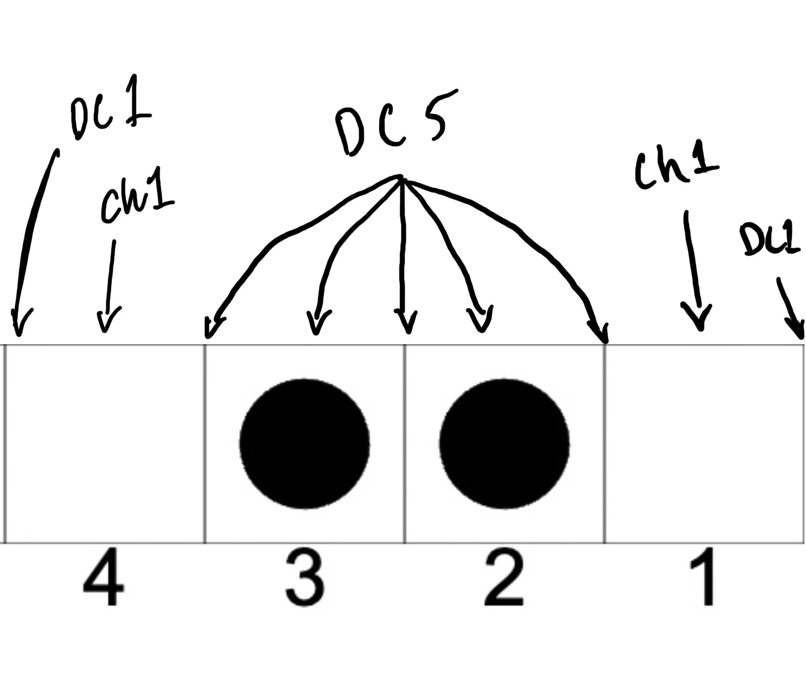 Row 1: Starting in the 5th chain from the hook, dc. Ch 1, then skipping a ch, dc. Repeat the pattern of ch 1, skip a ch, dc until the end of the row. Chain 3 and turn. You will have 89 (99, 111, 121, 133)(143, 155, 165, 177) sts.