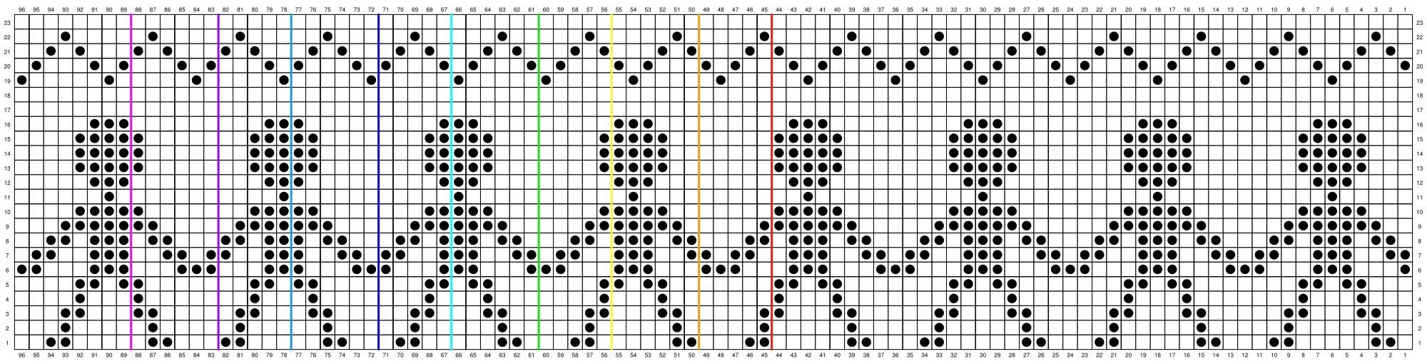 Rows 2-23: Follow the chart for the filet design, starting at the bottom right corner. Each size will work across the chart to their respective line. This will match the number of stitches you have for your size. The lines read right to left starting at red as XS, and continuing in the order as previously mentioned.